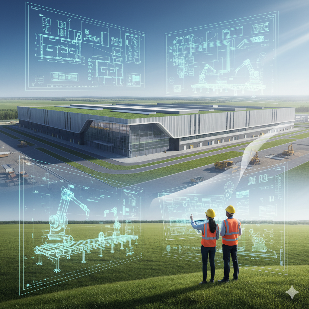 An architectural rendering or a blueprint overlaid with a modern factory exterior, symbolizing vision and comprehensive planning